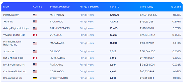 Top 10 public companies, the largest BTC holders. Source: buybitcoinworldwide.com