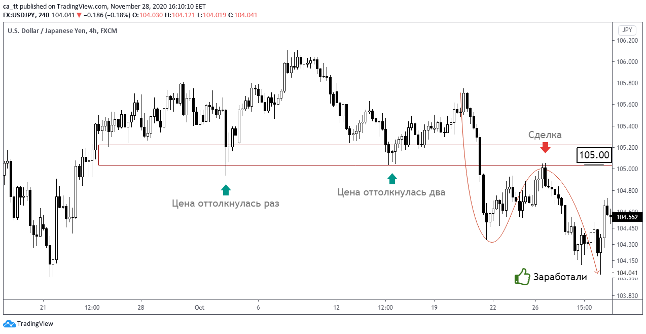 There were obvious clues on the chart that the price was about to go down. For example, the round level 105.00.