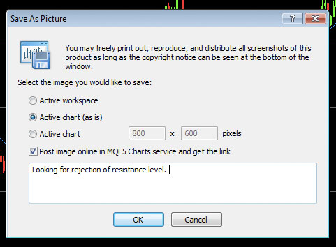 MetaTrader has a very convenient feature that allows you to take a quick screenshot of any chart by clicking on it and selecting Save as Picture.