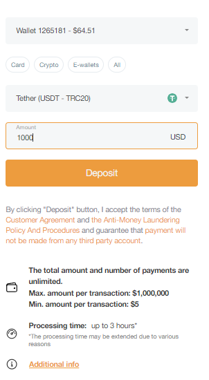 Go over to the Deposit section of your Trader Area, select Tether.