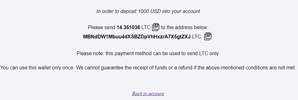 You will be redirected to the payment page with the wallet address to which the funds transfer is to be made and exact amount in LTC. To complete the transaction, you need to go to your wallet in another window and transfer the exact amount of LTC shown to the specified wallet address. Then, after the transfer is made, the funds will be booked to the account.