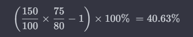 Total return: ((150 / 100) * (75 / 80) -1) * 100% = 40.6%