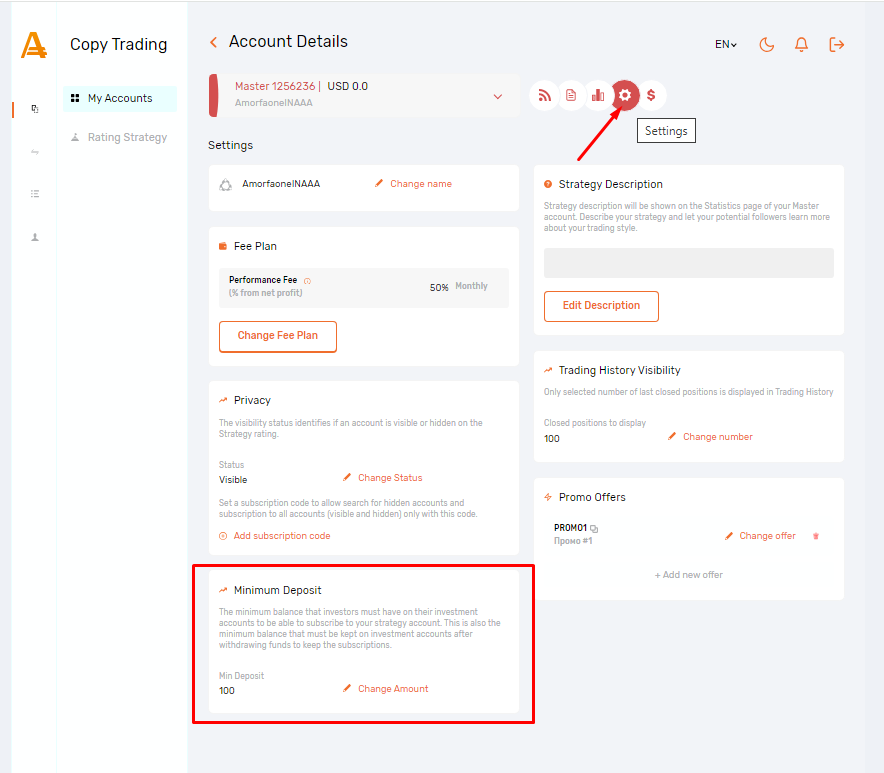 2. Choose the desired Strategy and click on the “Settings” icon next to your Master account;
