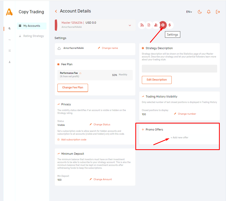 2. Select your Strategy and navigate to the “Settings” section by clicking on the corresponding icon next to your Master account.