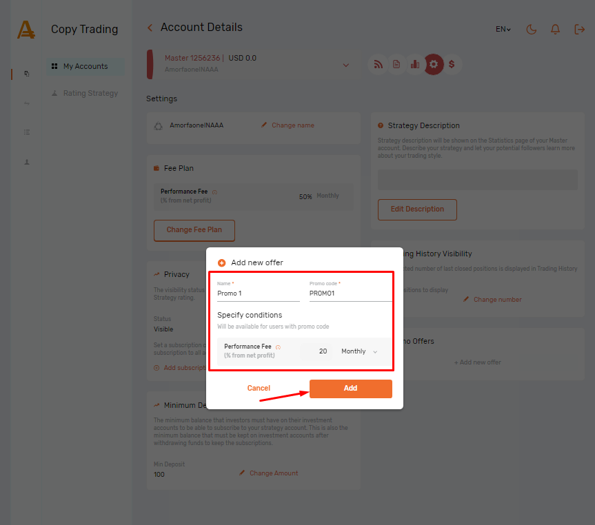 You can create one or multiple promotional offers for your Strategy, enticing potential investors with special discounts on performance fee payments. Each promotional offer links a unique promotional code to a performance fee that Investors must pay, providing them with more favorable commission terms than the default offer.