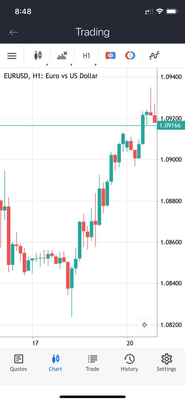 For added convenience, you can enable the one-click trading option by tapping on the third icon from the right in the top toolbar. Using this panel you can instantly send buy or sell market orders with specified volumes.