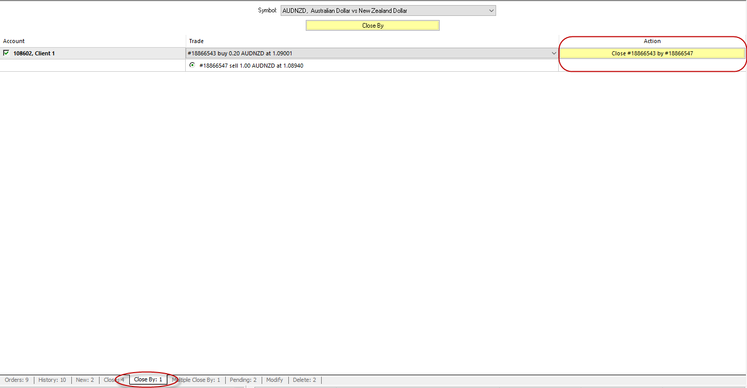 Please note: If the difference between counter positions volume sums is not equal to zero, the operation will result in opening of a new position with the volume equal to this difference. The newly opened position will further participate in multiple close but in accordance with its opening time (earlier positions will be closed first), until either all positions are closed or the last resulting position is opened.