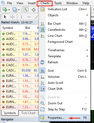 Select “Charts” in the menu and click on “Properties” in the drop-down list or simply press F8 on the keyboard.